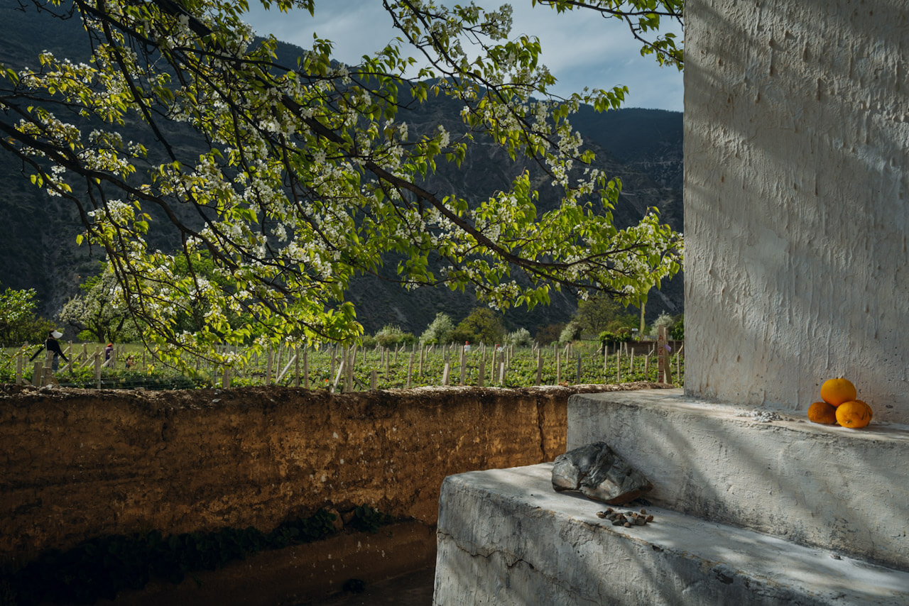 Shangri-La, China – vineyards around a Tibetan pagoda.