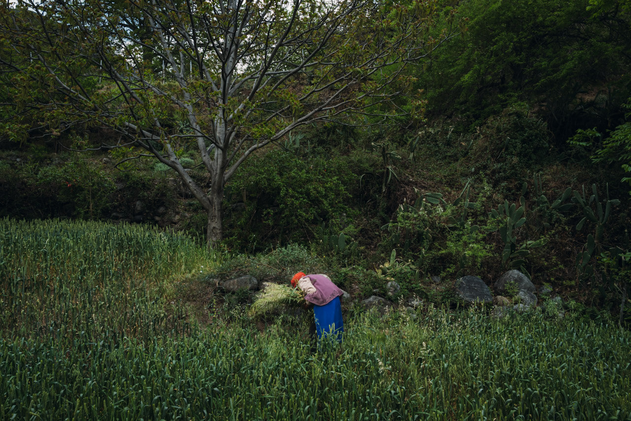 Shangri-La, China – a woman gathers crops in the terraced fields.