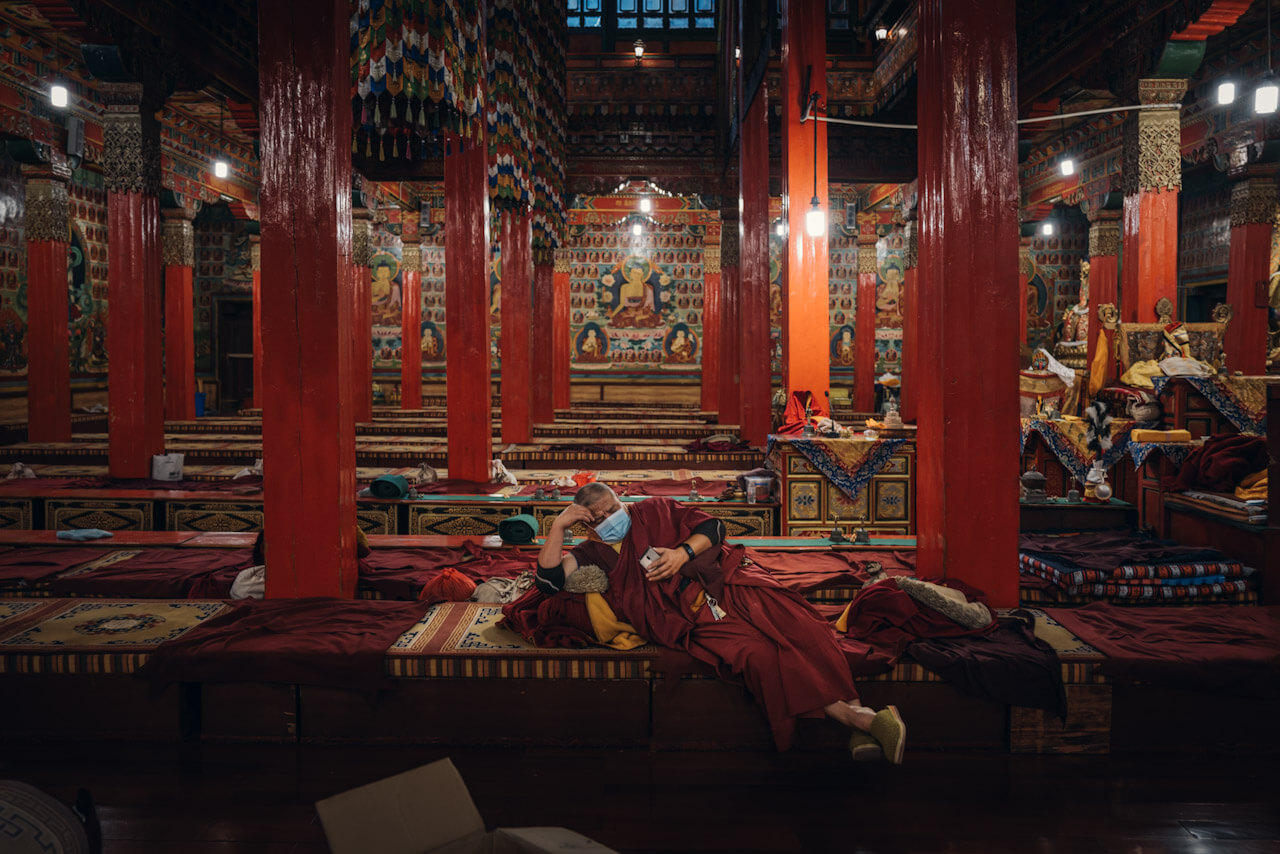 Shangri-La, China – a monk takes a break from creating a sand mandala.