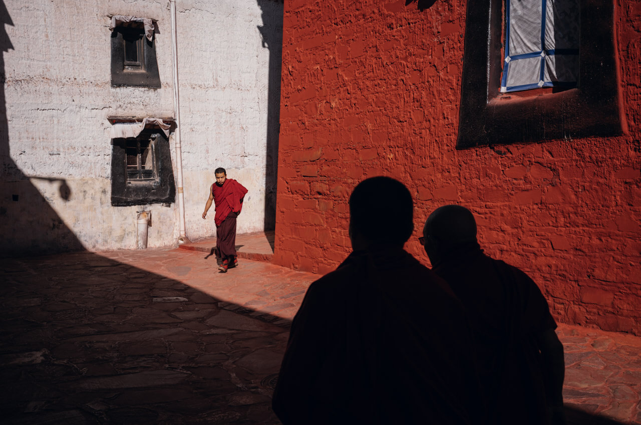 Shigatse, Tibet – monks cross the sunlit courtyard of Tashi Lhunpo Monastery.