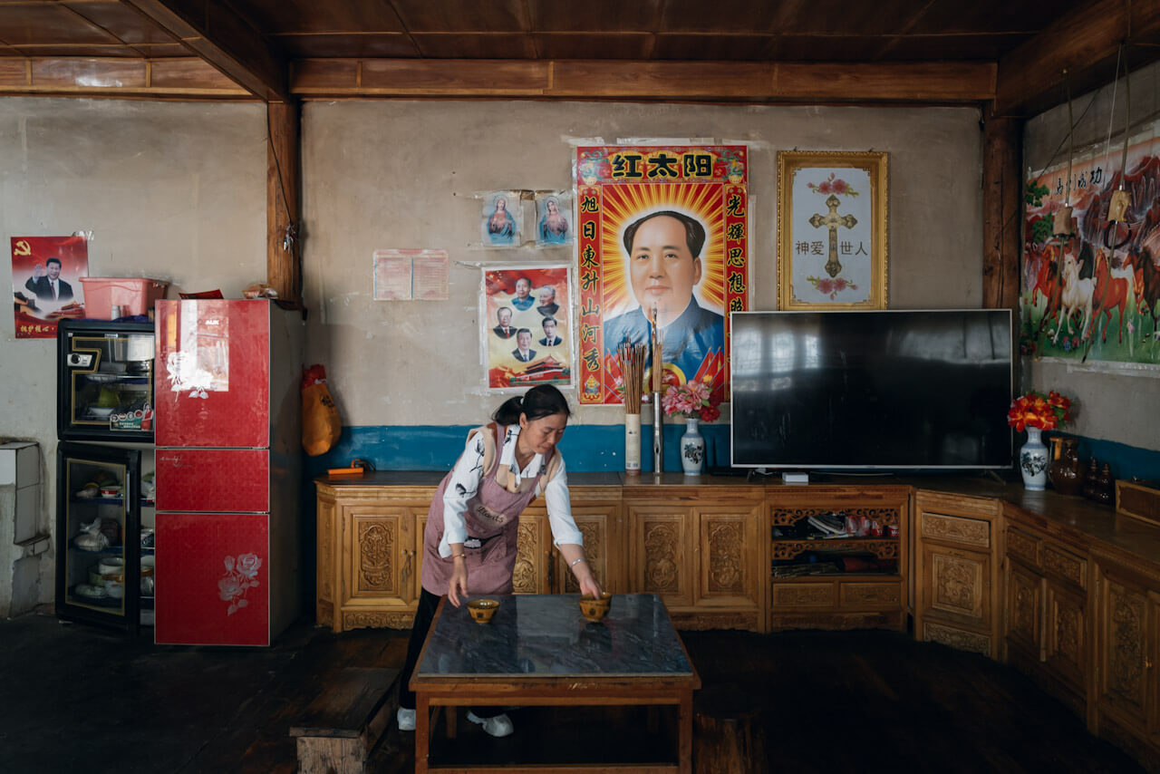Shangri-La, China – a Catholic Tibetan home in Tsedro village, Mao and Jesus share the wall.