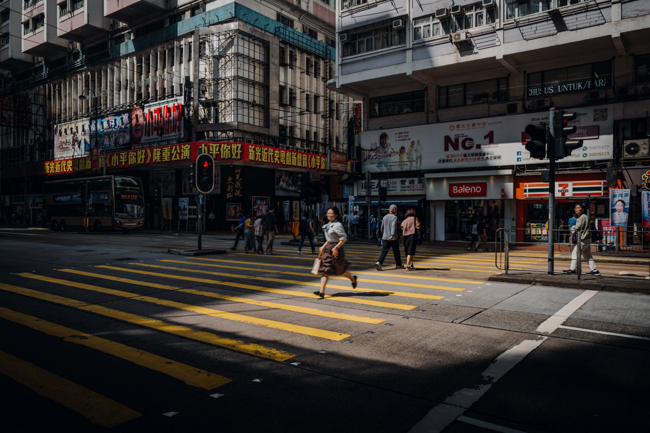 Hong Kong – a woman dashes across a busy crosswalk.
