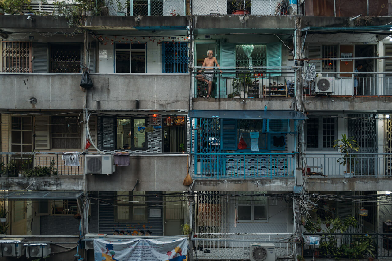 Ho Chi Minh City, Vietnam – a resident stands on the balcony of an old neighborhood.