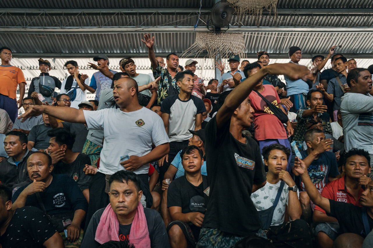 Bali, Indonesia – men placing bets between cockfighting matches.